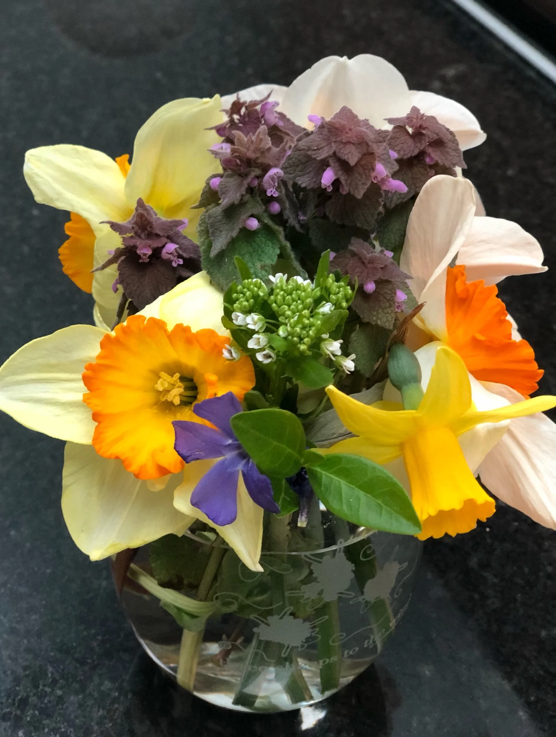This weekend, each time Elyse returned from a walk with her PopPop, her slim little hand seriously clutching a droopy bunch of weeds and flowers, a solemn offer of love: daffodils, ajuga, wild henbit, dandelions, and some other white wild flowers I couldn’t identify. She was so proud of her bouquets, wanting me to know just how much she loved me with this humble collection of wild and tame. I’ve received many such bouquets from my grandchildren over the years; their wonder at the beauty of their natural surroundings always blesses me, making me smile at their own joy in the giving of their gift.